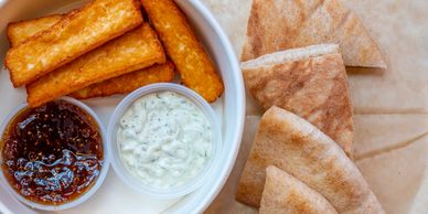 HALLOUMI CHEESE FRIED UPON ORDER STUFFED IN SAMMON BREAD WITH FIG JAM AND WHITE TAZIKI SAUCE