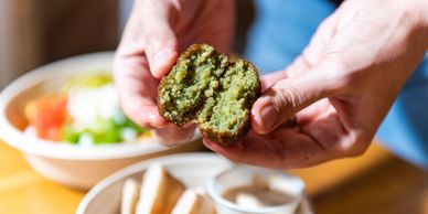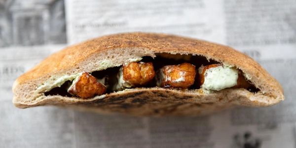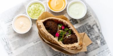 FALAFEL SANDWICH, SHREDDED LETTUCE, DICED TOMATOES, DICED ONIONS, DICED CUCUMBERS, PICKELED TURNIPS AND OUR SIGNATURE ICON SAUCE TAHINI.