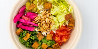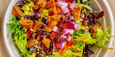 ARCADIAN MIX, EDAMAME, SAMMON CHIPS, SCALLIONS, KALAMATA OLIVE, PARSLEY MIX, CUCUMBER, TOMATOES, GREEN PEPPERS, PICKLED TURNIPS, CRANBERRY SPICE AND OUR ICON DRESSING.