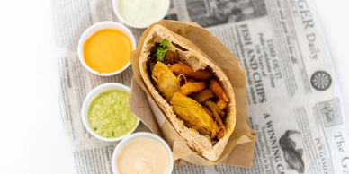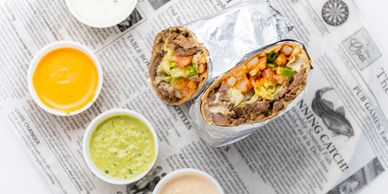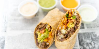 WHOLE WHEAT TORTILLA FILLED WITH YELLOW BASMATI RICE, PICK OF PROTEIN, SPICY GARLIC SAUCE, SCALLIONS, CHOPPED LETTUCE, TOMATOES, PICKLED CUCUMBER, AND FRIES INSIDE.