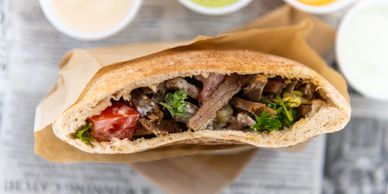 SANDWICH FILLED WITH THIN SLICES OF STEAK, SHREDDED LETTUCE, ITALIAN PARSLEY MIX , DICED TOMATOES, TURSHI CUCUMBER & OUR SIGNATURE ICON SAUCE