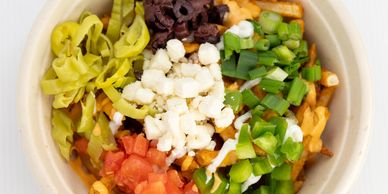 CODED FRENCH FRIES TOPPED WITH DICED BELL PEPPERS, DICED TOMATOES, PEPPERONCINI'S,